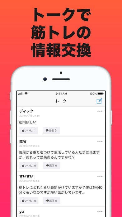 ・筋トレ情報を交換することができます。トレーニー同士の交流にご活用ください。