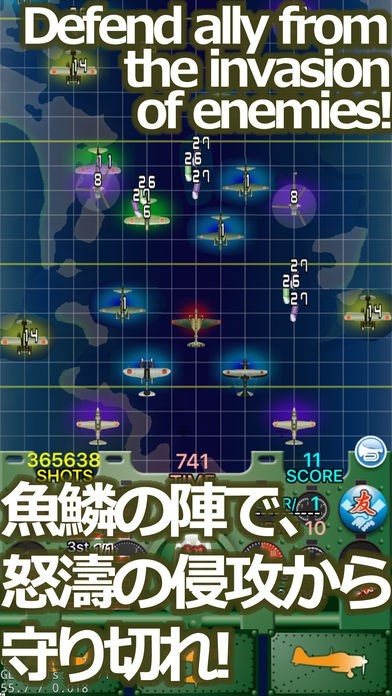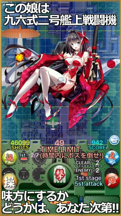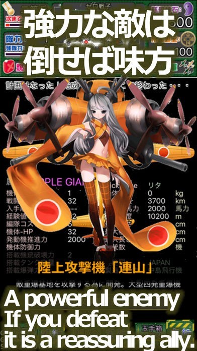 大本営からの指令に従って、各コースに登場する強力なボスキャラクターを倒しながら、入手した戦闘機や装備を、合成し強化しレベルアップさせながらコース攻略をしてゆくアプリゲームです。