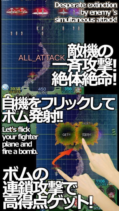 戦闘機に搭載できる爆弾を使用して、敵機を倒すことができます。敵を連鎖させて倒すことで、得点が、2倍4倍となり、高得点を狙うことができます。
