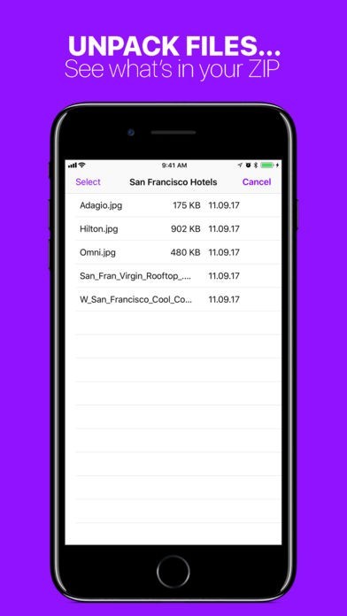• Unarchive a ZIP into a file browser, preview your files, and selectively share or save them.
