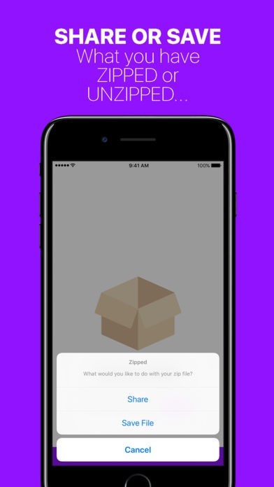 • Ability to Share your ZIP file or UNZIPPED files, or SAVE them to Files.