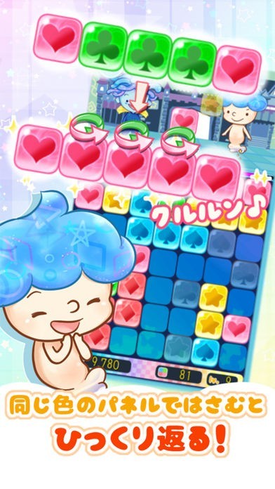 今までにない“ひっくり返して消す”ことが最大の特徴。つやつやパネルの超大連鎖がきもちいい爽快パズルゲームです。お邪魔キャラの邪魔はもちろん、どんどん早くなるスピードにキミはついてこれるかな…!?