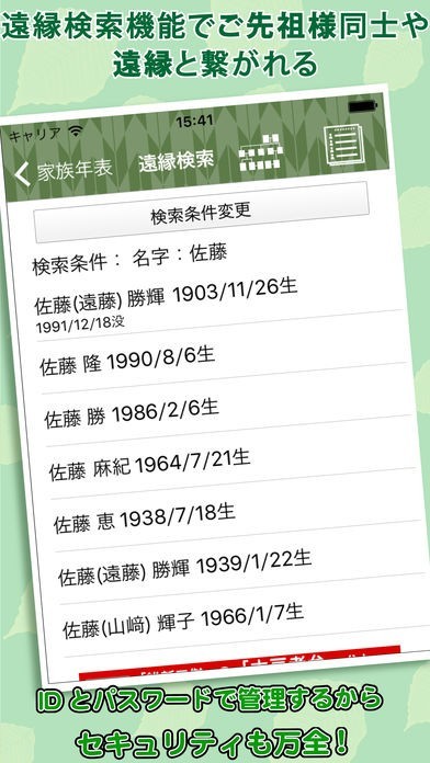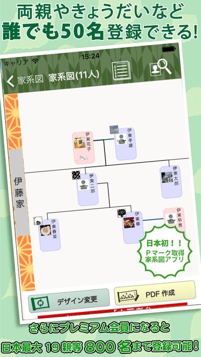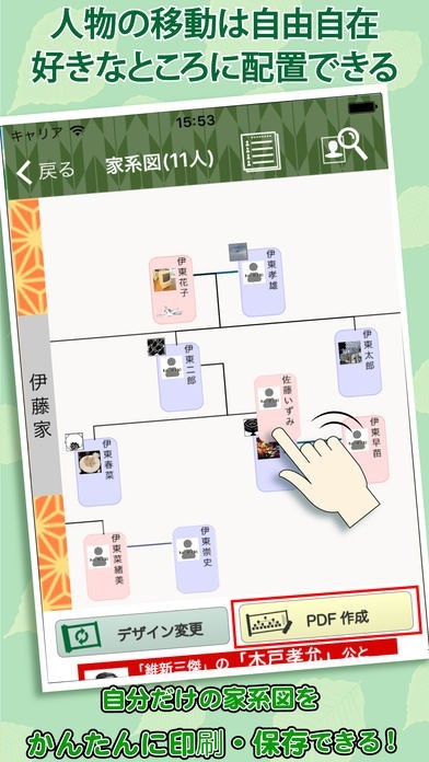 人物の位置を自由移動でき、自分なりの家系図が作れるので、ルーツがわかり面白いです。