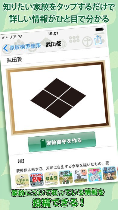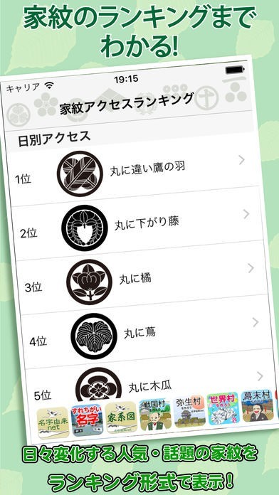 このアプリをインストールすると、簡単な操作で日本全国の家紋情報が一瞬で表示されます。会員数は15万人を突破した、人気のアプリです。家紋情報は常にアップデートされ、最新情報をお届けします。