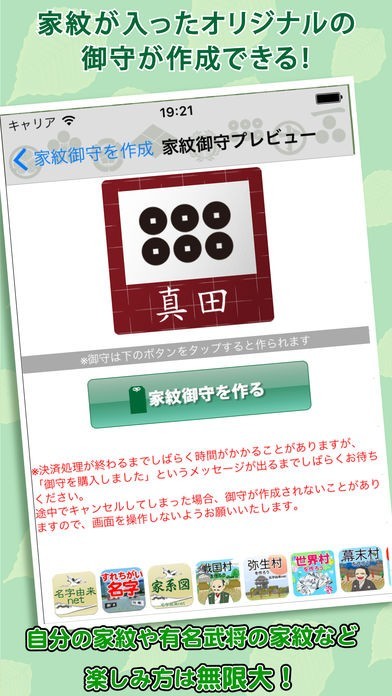 好きな戦国武将の家紋や、自分の家の家紋など、お気に入りの家紋を見つけたら家紋入りの御守りをアプリ上で作ることができます。好きな家紋のページからタップするだけで簡単に作れます。