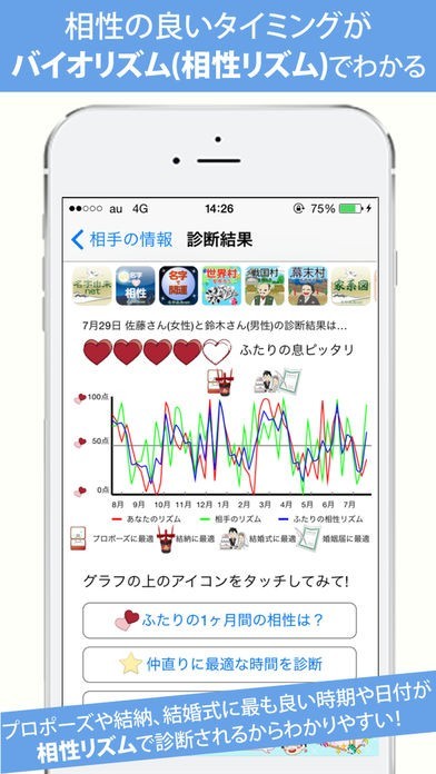 苗字や日付などの入力で相性の良いタイミングバイオリズムがわかる