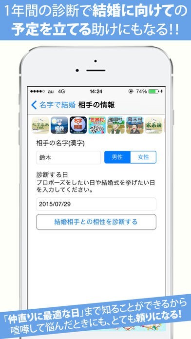 苗字で占うというありそうであまりない珍しいタイプの占いですが、結婚を考える二人には適した占いアプリです。結婚は初めての場合が多いので、サクサクとはなかなか進めづらいはずです。だからアプリにタイミングを教えてもらうことで行動するきっかけづくりになるし、日常的にアプリを使用していると常に結婚のことを意識するようになり、自然と良い結婚を目指せていけます。