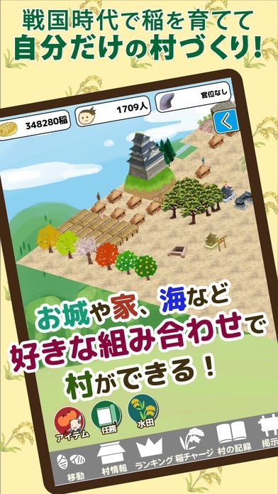 日本の好きな地域を選び、自分の名字を冠した村の長として「戦国時代の村を作る」ゲームをすすめます。田んぼで大切な稲を育て収穫することで、稲ポイントを増やします。稲ポイントを活用し、城や住居、米蔵を建てることができるので、村人や仲間を増やしながら、村を大きくしていくのがあなたの使命です。 途中、外部から村を攻めてくる武将や侵入者などが多数やってきます。村を守り抜くためには商人から鉄砲や武器や防具を効率よく手に入れることも重要。村が大きくなっていくと南蛮人や朝廷、中国大陸から使者がやってくることもあり、次第に村が有名になっていきます。最初の村民は、伴侶と自分の二人だけ。これから先、あなたの村は戦国時代を生き抜き、天下統一を果たすことができるのか・・・。