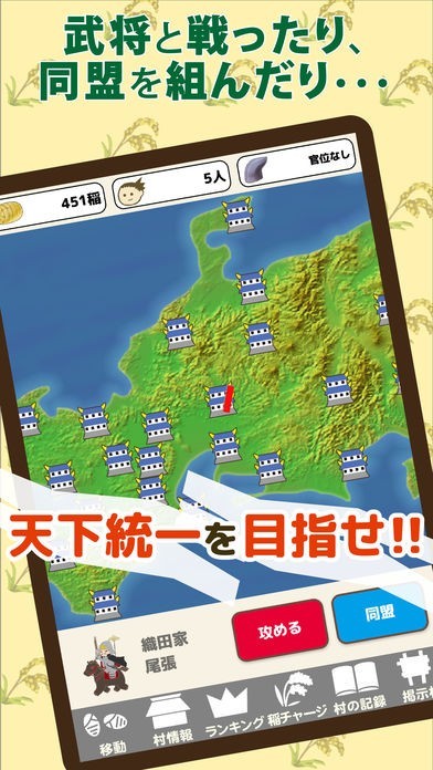 織田信長、徳川家康、武田信玄、上杉謙信、毛利元就、北条氏康、島津義久、伊達政宗、真田昌幸といった群雄割拠している敵達を倒し、あなたの村が天下統一を果たすことができるのか!?