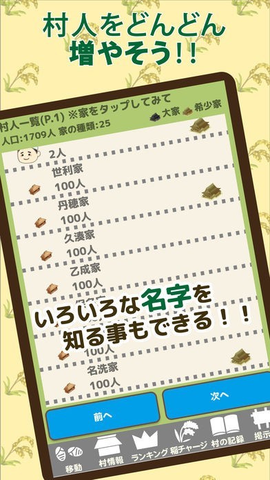 名字(苗字)に興味のある方もない方も、自分の名字を冠した村を成長させ、天下統一を果たすことができるゲームです。ランキングでは日本中・世界中で最も強い村と村の発展を競うことができます。家族が少人数化していく現代だからこそ、稲を刈り自分の家族を増やし、村が大きくなる醍醐味を体験しましょう。大ヒットゲーム「戦国村を作ろう」の第二弾、群雄割拠の戦国時代を舞台にした「稲刈り村育成型シミュレーションアプリ」です。
