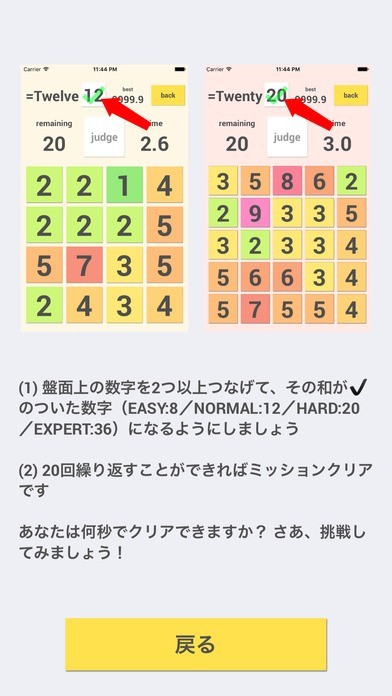 (1) 盤面上の数字を2つ以上つなげて、その和が緑のチェックマークのついた数字(EASY:8/NORMAL:12/HARD:20/EXPERT:36)になるようにしましょう