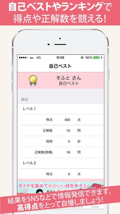 自己ベスト機能でジャンルごとの最高得点や正解数が分かる