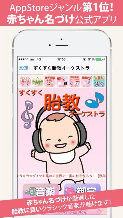 「すくすく胎教オーケストラ ~妊婦さんNo.1赤ちゃん名づけ公式〜」では、妊娠中の方のストレス解消にも一役買ってくれるミュージックアプリです。「音楽」機能には初めから入っているクラッシックミュージックが三曲収録しているのでアプリ内にて再生するだけでも充分楽しめます。しかし、もっと様々な音楽を聴きたい方は課金する事で更に聴ける曲が増えます。これにより、ちょっとしたイライラや妊娠に対する不安も和らいでくれるでしょう。また子供を安心して埋めるような「パワー写真」では、日本各地にある様々なパワースポットの写真を買うことができる機能により、安定期に入る前の方も恩恵を受けることが可能でしょう。また、