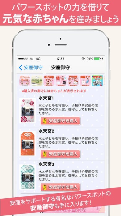 全国の水天宮を始めとする安産御守りが購入可能です。名前を入れて世界に一つだけの御守りを作ることもできます。また、パワースポットで有名な神社を待ち受け画面に設定できるので、安産で出産できるまで毎日眺めて元気な赤ちゃんを出産しましょう。