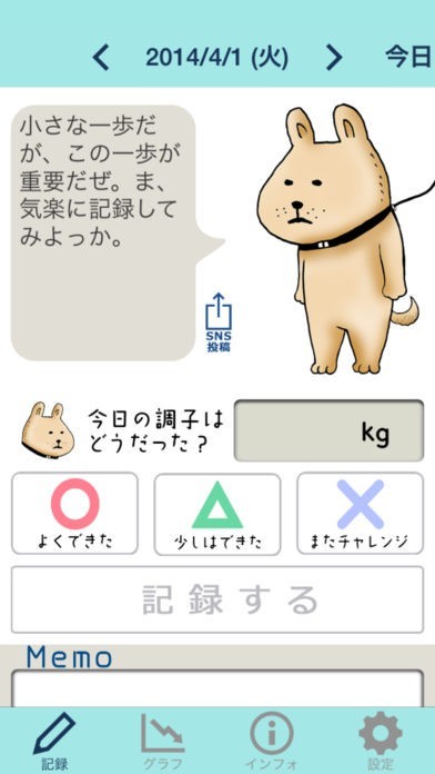 ・ダイエットへの取り組みの評価と体重(入力しなくても可)を記録、グラフ表示。