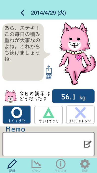 ・食事の内容や運動の記録、1日の感想などが書けるメモ機能。