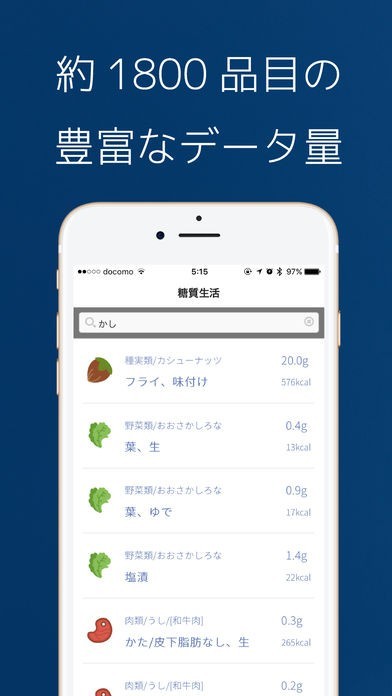 産後太りなどでダイエットしたいという主婦の方に便利なのがこのアプリです。 食品によって糖質やカロリーの含有量が異なります。 意外な食品に多くの糖質やカロリーが含まれている事があるため、十分な知識が無いとダイエットしたいと思っても難しい事がありました。 そんな時でも検索機能により、100g当たりの食品に含まれている糖質とカロリーの含有量がすぐに分かります。 十分な知識が得られるため、糖質制限ダイエットを行いたい時に役立つアプリになっています。 検索ボックスにキーワードを入力するだけと使い方は簡単です。 食品数のデータはおよそ1,800、ダイエットメニューのレシピを考えたい時にも便利です。
