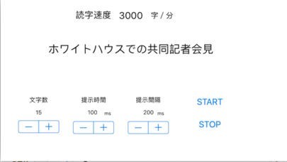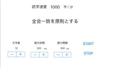 まずは「文字数10、提示間隔300ms、提示間隔300ms」で読字速度1000字/分からスタートし、徐々に速度をあげて4000字/分を目指してください。