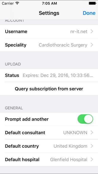 Once procedures have been successfully uploaded, they will be deleted from the app. No patient identifiable information will be retained on your device. We recommend uploading data immediately or as soon as a network 3G/Wi-Fi signal is available. If upload is interrupted due to signal loss for example, data not yet uploaded will be retained until a successful upload is achieved.
