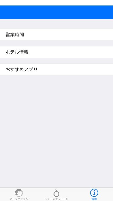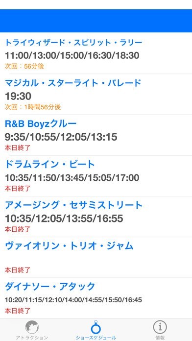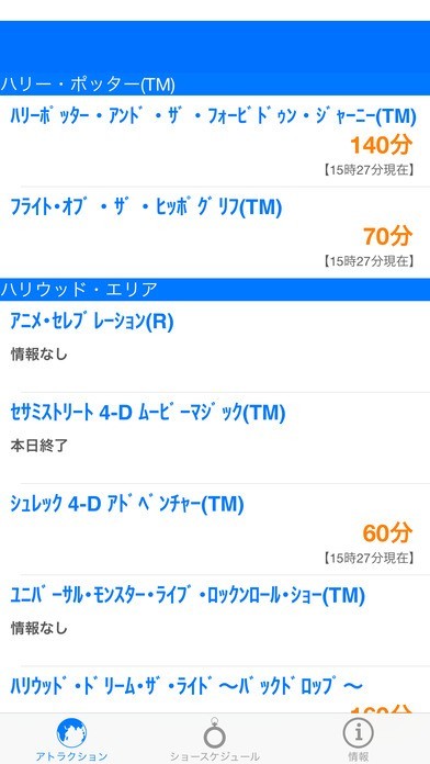 今や定番となったテーマパークUSJを利用する方には必見のアプリです。 「アトラクション待ち時間(U)」では、アトラクションやショースケジュールンなどに関した情報を手に入れることが出来ます。 使い方は、「アトラクション」「ショースケジュール」「情報」といったコンテンツをそれぞれタップして必要な情報を得ていきます。 「アトラクション」では、待ち時間を知る事が出来、その情報はリアルタイムに近いものであるため効率的なアトラクション周りに役立ちます。 「ショースケジュール」では、その名の通り次回のショーの開始時間を知ることが出来るためこちらも効率的に遊ぶのに便利です。 また、「情報」からは営業時間やホテルの予約などもできるため、計画段階から活用することの出来るお役立ちアプリです。