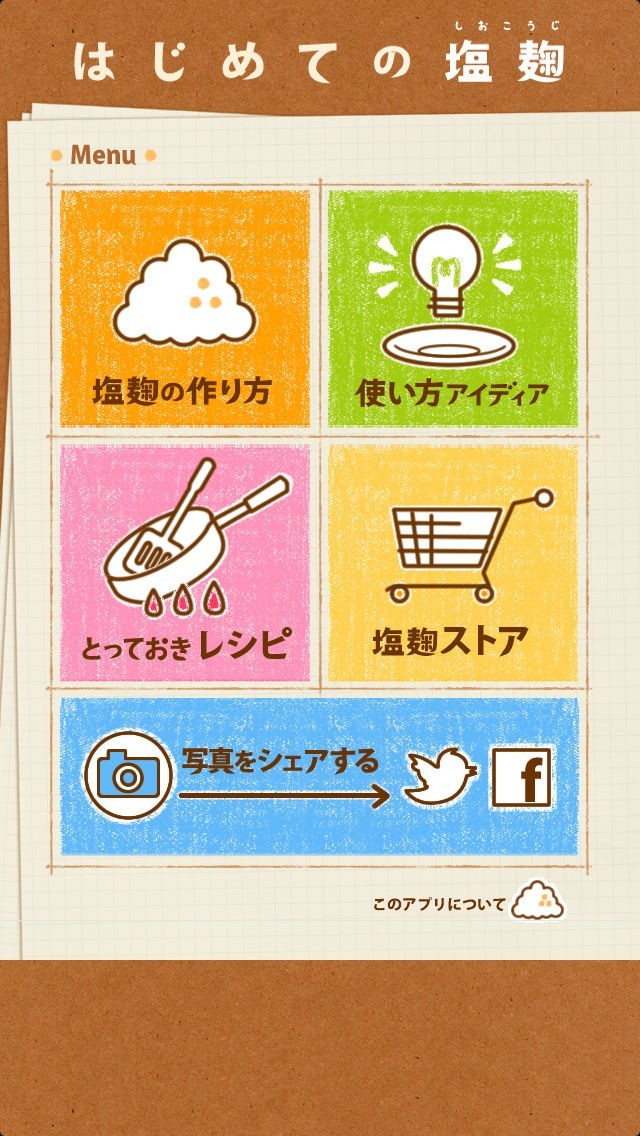 TwitterとFacebookに写真を簡単にアップできる機能です。塩麹を使った料理ができ上がったら、みんなに公開して、楽しんじゃいましょう!