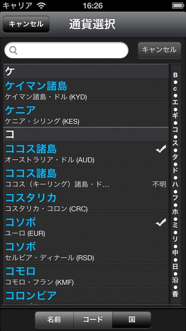 ◆ simple and fast currency selection: just tap on the 'Edit' button to edit the table and add new currencies, remove currencies or modify the currencies currently in the table; then the list of available currencies will appear, and you can have it sorted by currency name, currency code or countries; you can search the list, too
