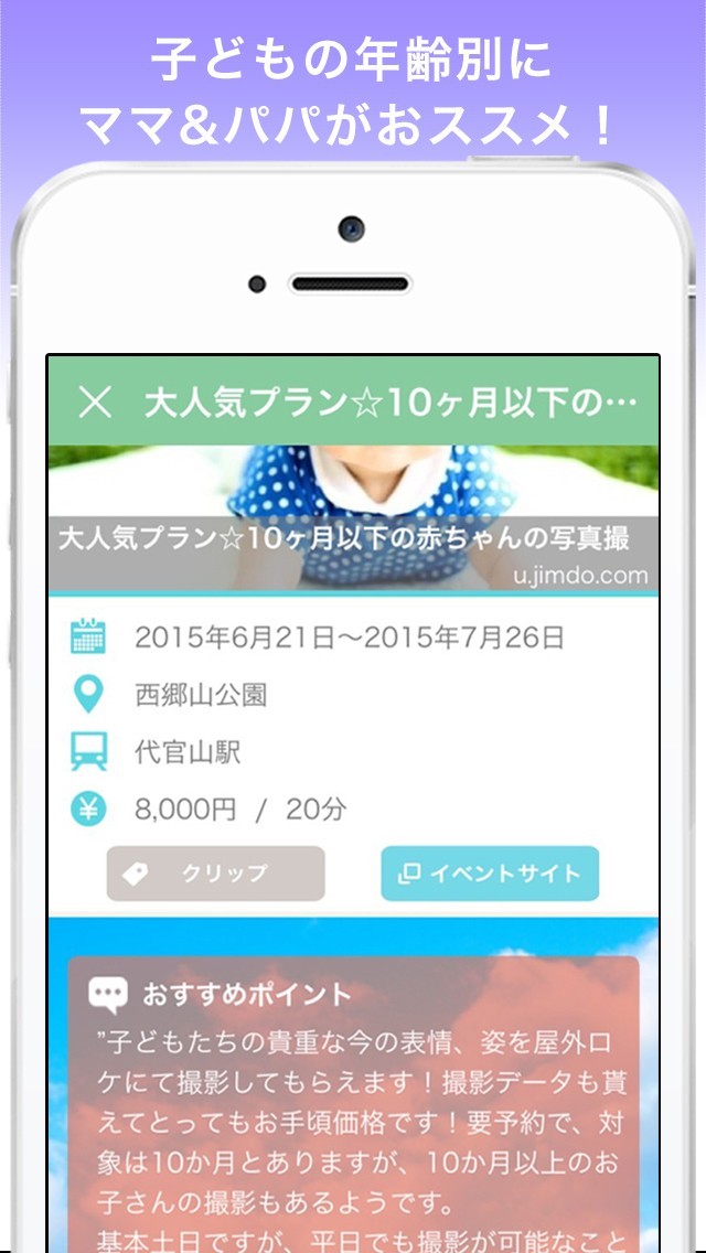 在住エリアごとのおでかけ情報をチェックすることができます。東京、神奈川、千葉などの対象エリアについての詳細なスポット情報を取得することができるため、休日のおでかけに役立ってくれます。
