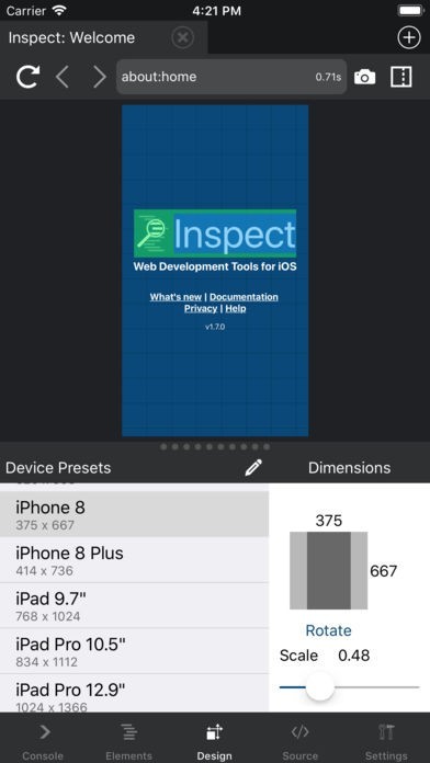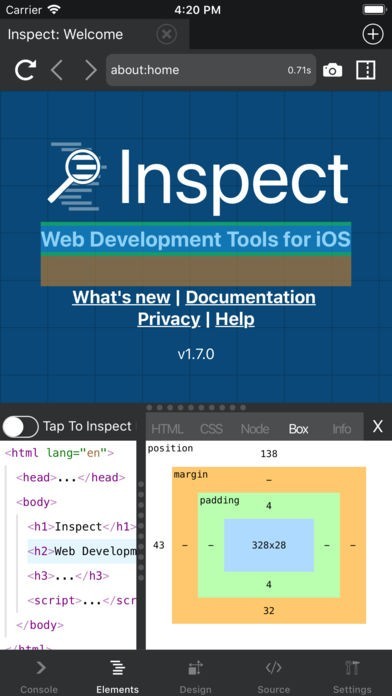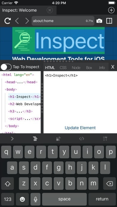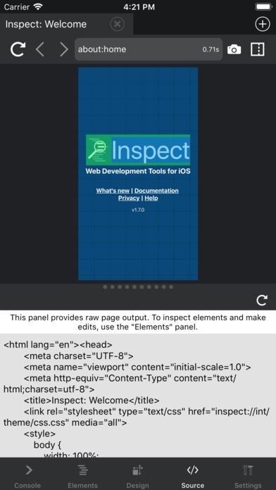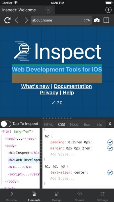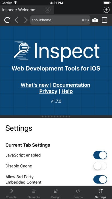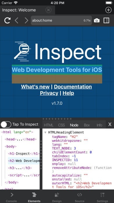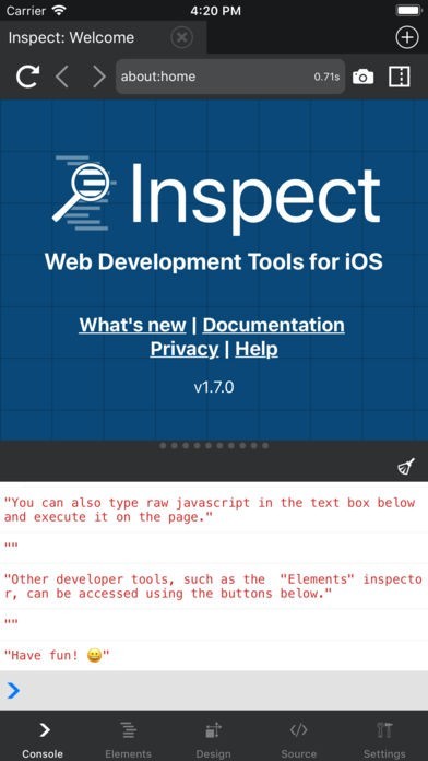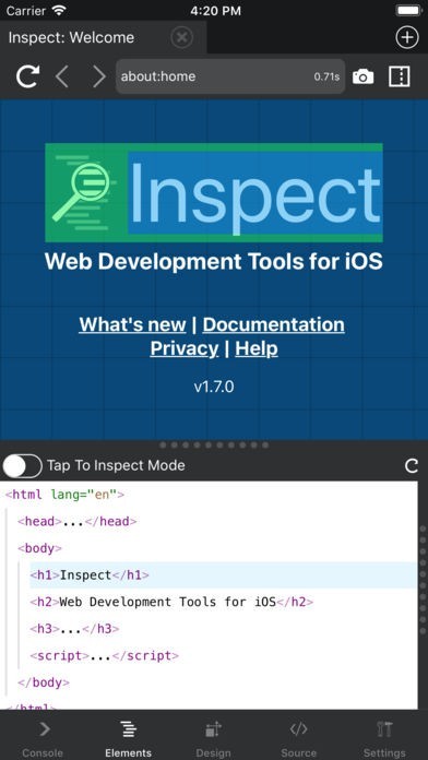 Inspect is a web inspector for iOS that provides desktop-class developer tools, right in the app. No need for remote debugging, connecting to a desktop, proxies, or remote systems.
