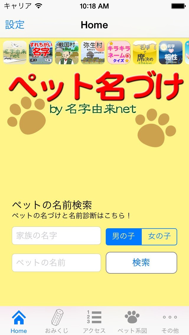 App Storeアプリ総合第一位を獲得し、ダウンロード数300万を突破した名字由来netを製作した会社が、そのノウハウを使って作った「無料 ペット名付け」 ペットの名前で検索するだけで画数とその意味を知ることができ、姓名判断や名前診断に活用できます。 また、家系図業界唯一のプライバシーマーク取得企業が運営しているため、信頼感は抜群です。 名前診断だけでなく、「ペットの名前おみくじ」も引けるので毎日アプリを楽しむこともできます。