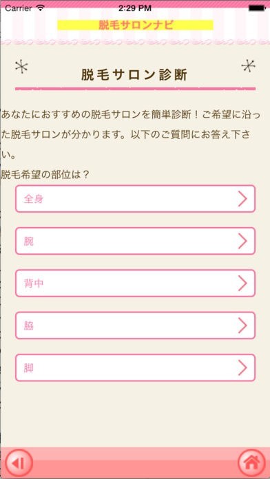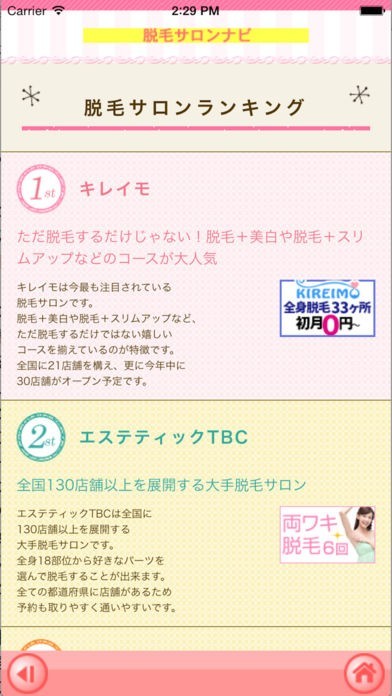 App Storeより引用サロンで脱毛するなら一番得をするところへ通いたい!けど「サロンの数が多すぎてどこを選んで良いのか分からない」、「公式HPを見たってどこも同じようなことが書いてある」と、サロンを選ぶ基準の判断がイマイチよくわからないという口コミの声も多数。そこで、口コミの評判が良く、料金的にも納得できる人気脱毛サロンをランキングにしました。お得なサロンで脱毛したい人必見です!