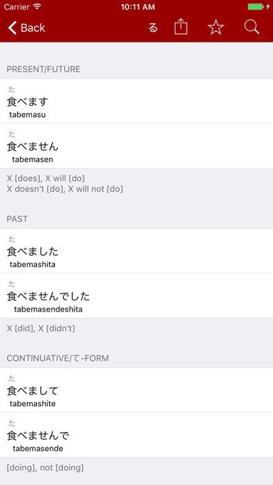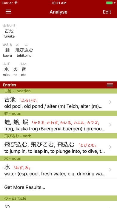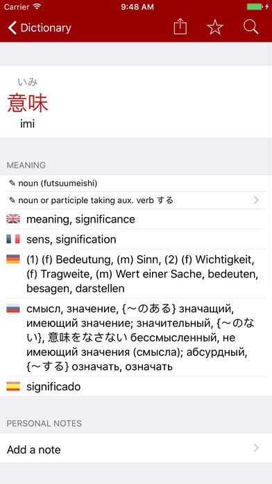 imiwa? (Japanese dictionary)で表示される例文や漢字などはすべてひらがなが用意されており、ローマ字による発音も表記されているため、外国語から日本語への学習に便利です。