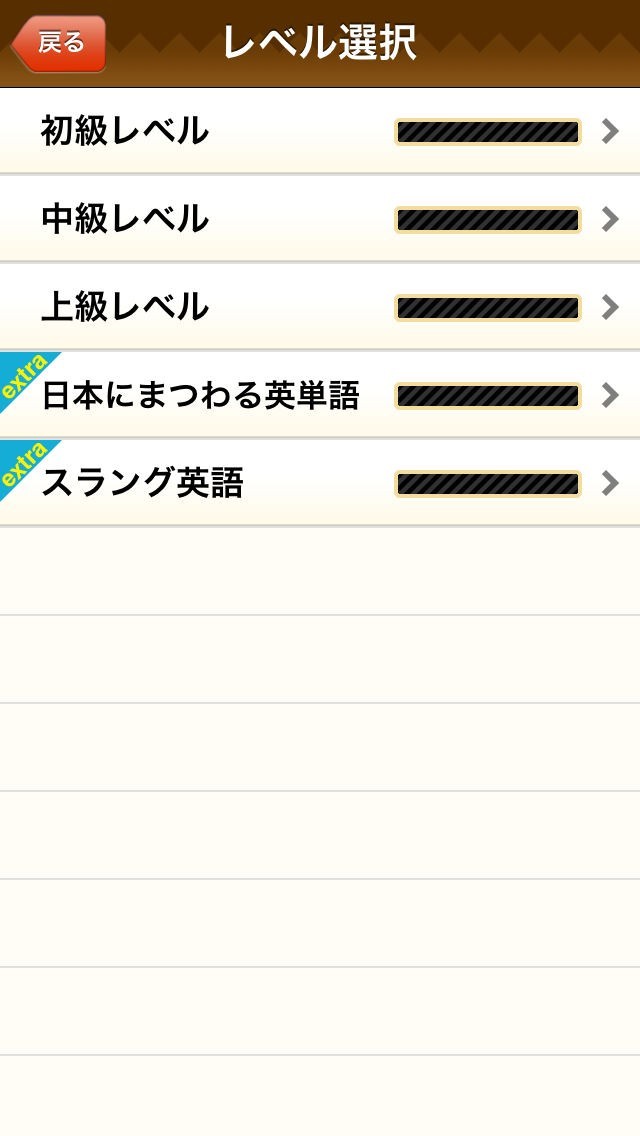 問題のレベルを選択でき、正解不正解の単語もチェックできるので弱点を見つけやすい