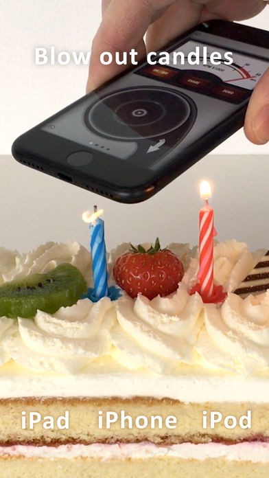 ケーキの蝋燭に火をつけたらアプリを起動してください。次にスピーカー部分を蝋燭に近づけます。吹き出る風は強くないので一度に1本だけにあててください。注意深く慎重に行うのがコツです。