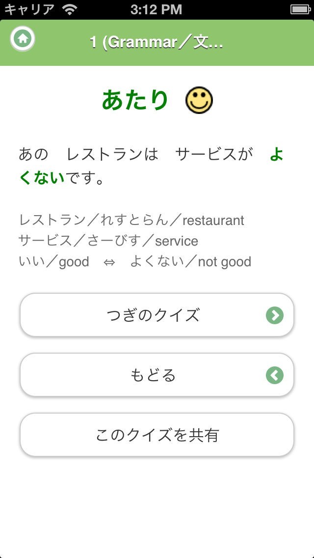 3択クイズで繰り返し日本語が学べる!わからない問題はTwitter・facebookで共有して疑問も解決!
