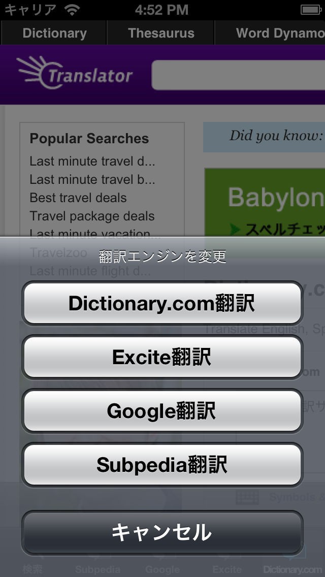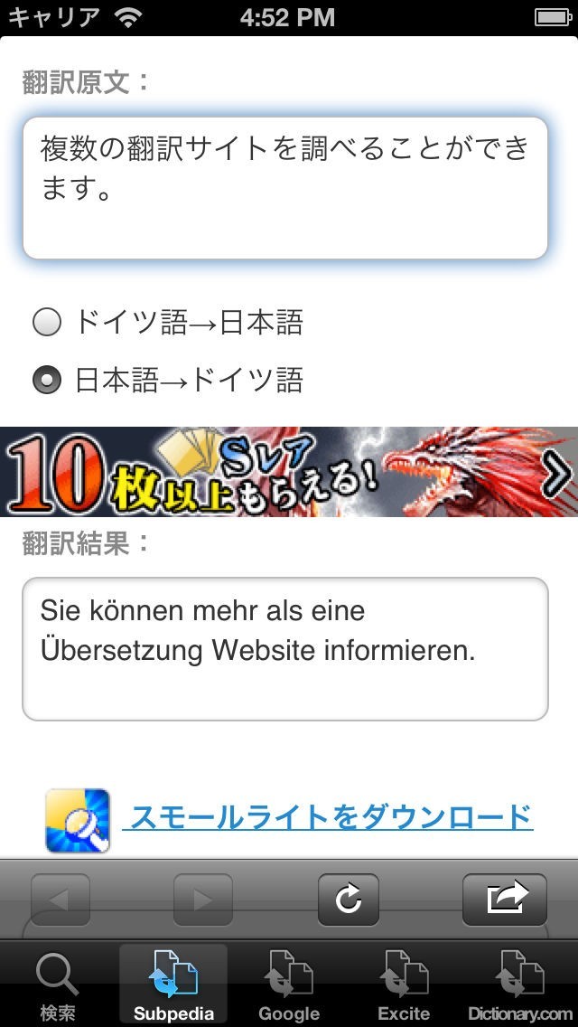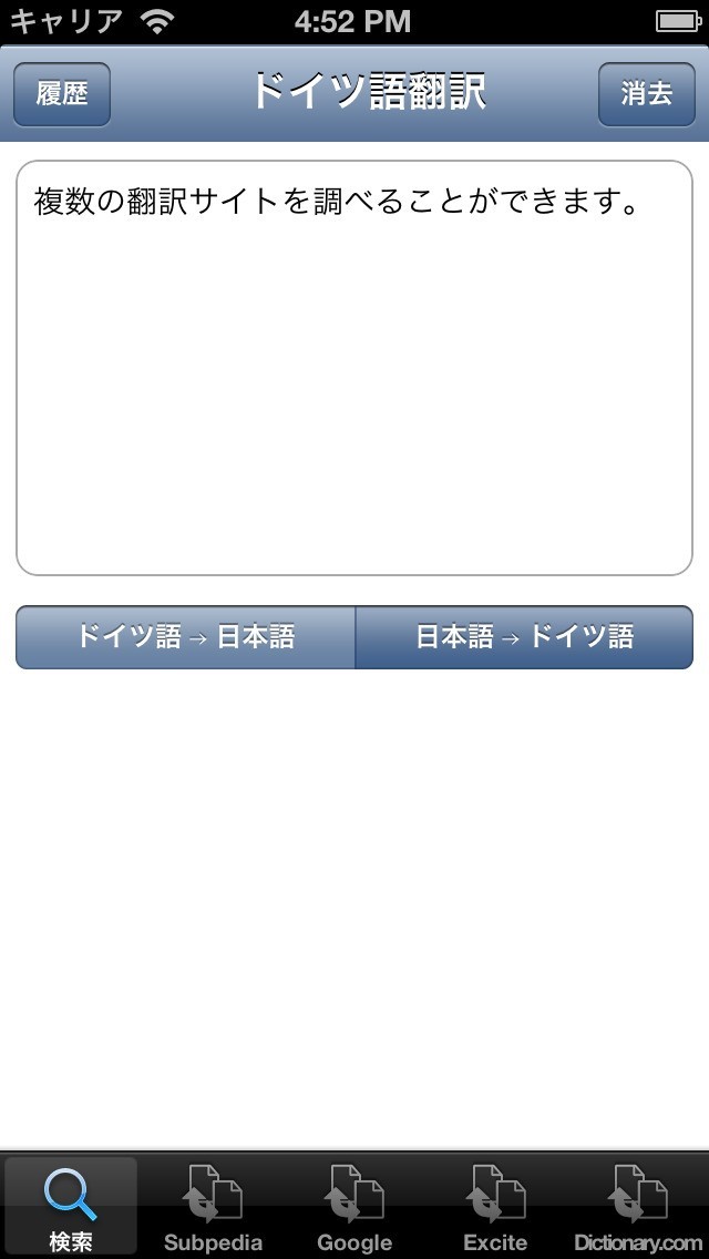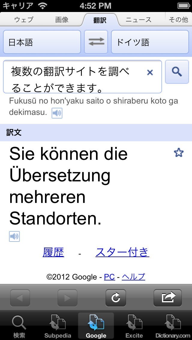 App Storeより引用『ドイツ語翻訳』なら、文章を一度入力するだけで、複数の翻訳サイトを調べられます。たとえば、Google翻訳が意味不明な場合にも、タブを切り替えるだけでExcite翻訳やDictionary.com翻訳の結果を見ることができるんです。