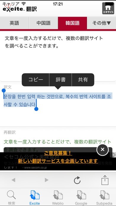 韓国語翻訳のスクリーンショット