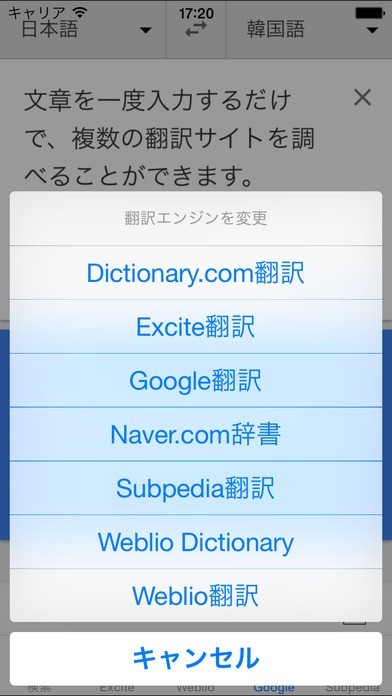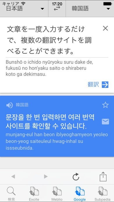 キーワード検索すれば韓国語を複数のサイトを1度に翻訳できてしまう辞書アプリ