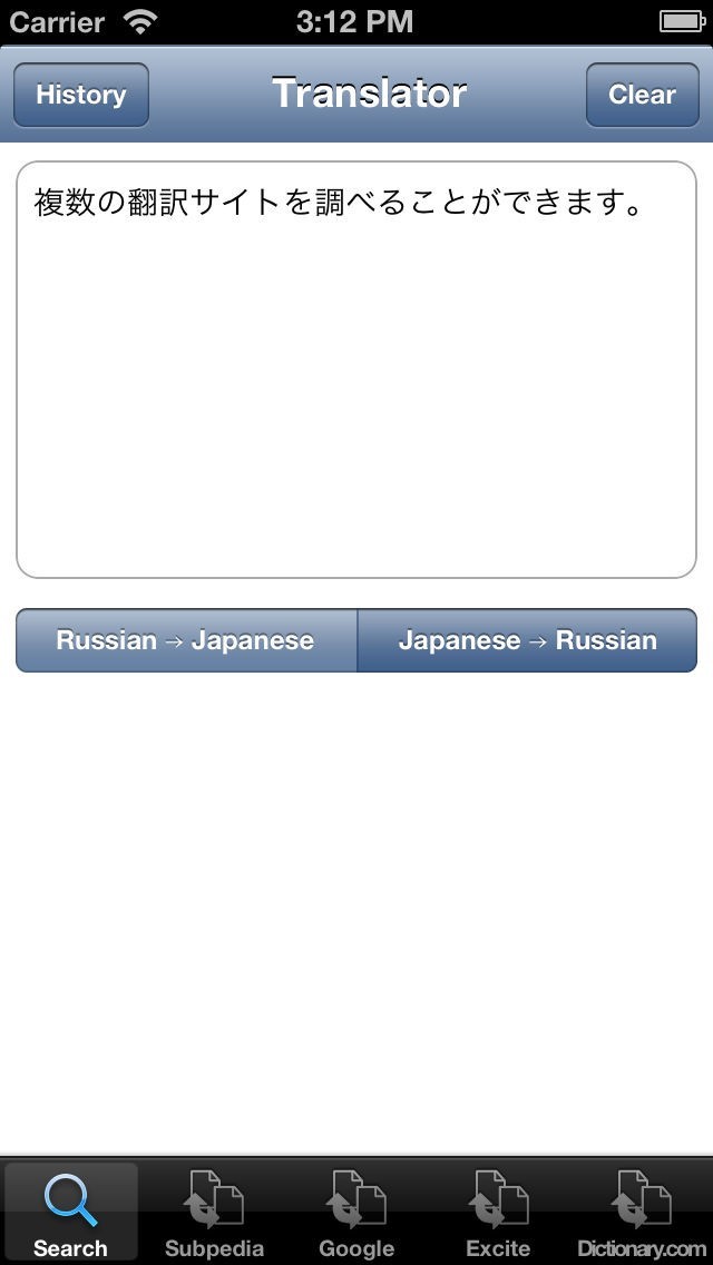 「ロシア語翻訳」はその名の通り、ロシア語の翻訳アプリです。翻訳したい文章を入力すれば、Google翻訳やExcite翻訳など、複数のサイトで翻訳。一つ一つのサイトを訪れる手間を省いてくれます。