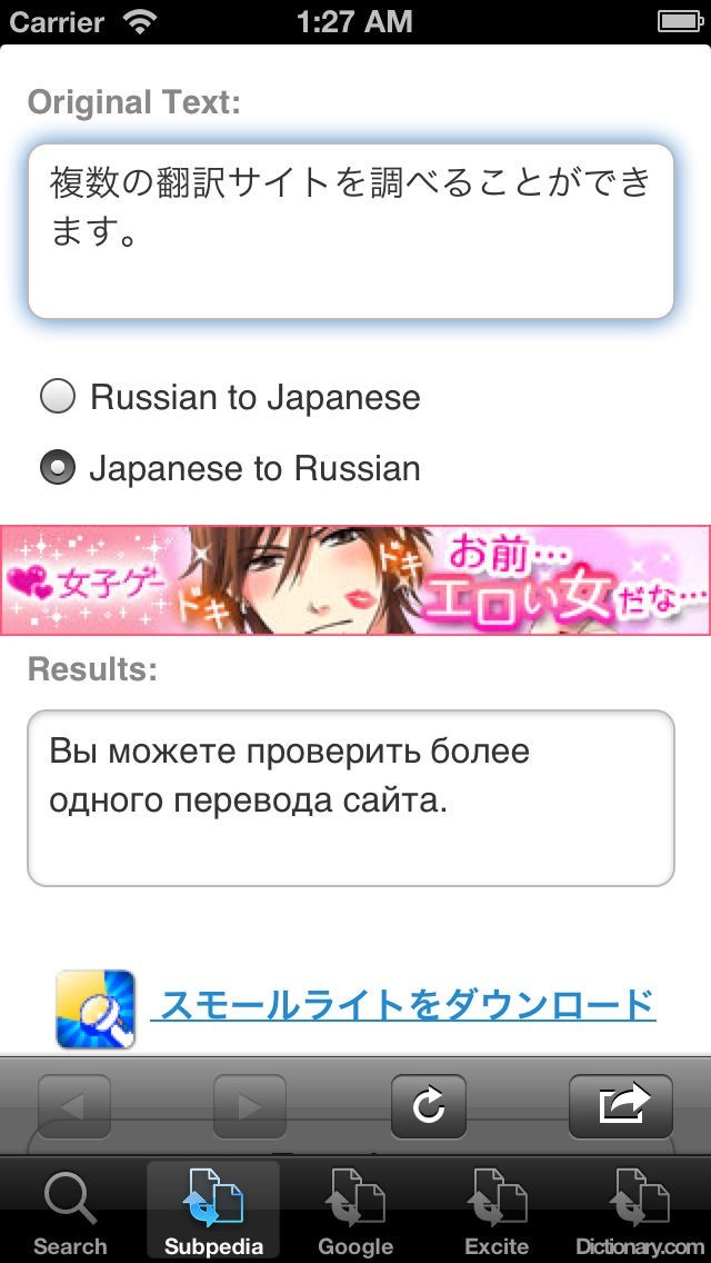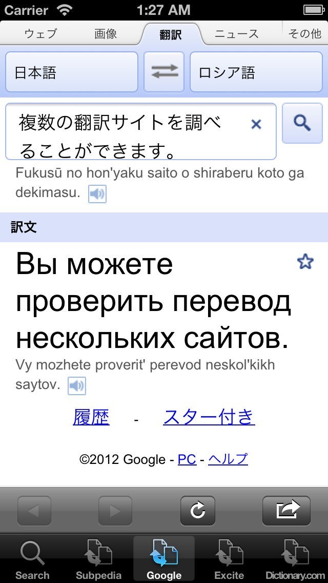 翻訳サイト一つ一つにアクセスする必要がなく、一つの文章を入れるだけで簡単に複数の本若サイトで翻訳され、意味を確認することができます。ロシア語から日本語、日本語からロシア語への翻訳がワンタッチで確認できます。