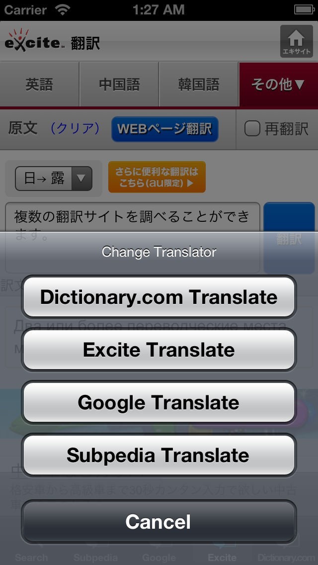 翻訳サイトへの切り替えはタブをタッチするだけで可能