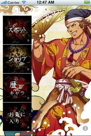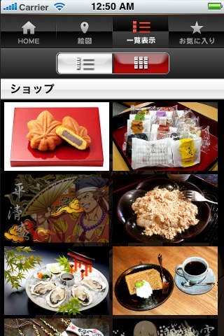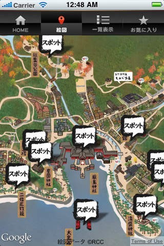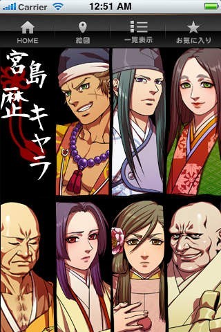 App Storeより引用オリジナルの宮島イラストマップ(絵地図)を舞台に平安時代のキャラクター(平清盛、源頼朝、他)が随所に登場。