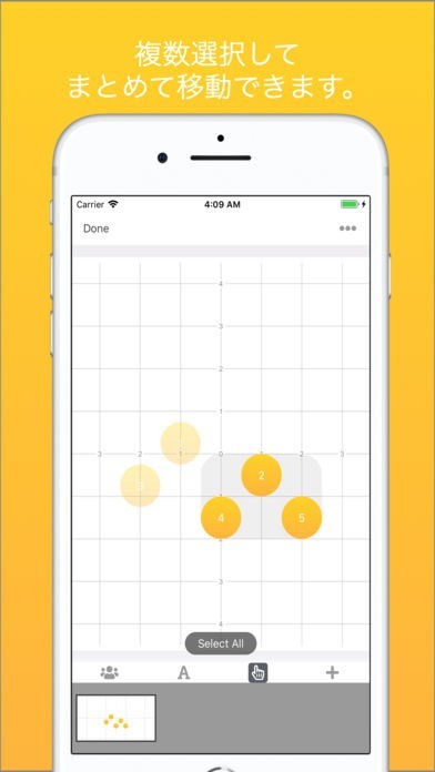 このアプリでは人を色のついた円で表示します。通常では大きめの円ですが大人数にも対応できるように円を小さくすることが出来るので大人数のフォーメーション決めにもお勧めです。