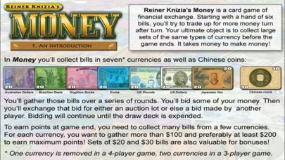 Though Money is one of Reiner Knizia's deepest (and richest) card games, it's all been carefully fit into this iPhone release. Recolored bills make it easy to read your currency. Simple gestures allow you to examine your own hand and the bids of your opponents. Everything is animated, for a colorful play experience.