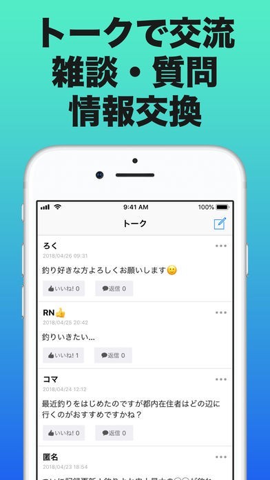 利用者どうしでメッセージのやり取りができるトーク機能も搭載されています。釣り仲間を増やしたり、暇潰しに釣りの話で盛り上がったり、情報交換に活用したりと様々な使い方ができます。