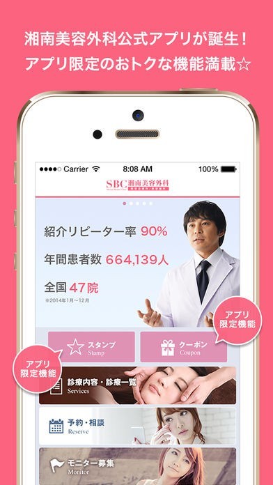 湘南美容外科に通いたいと思っている、そんな人に最適なのがこのアプリです。お得な期間限定のクーポンを取得、新しいものが追加されたら通知でしらせてくれます。また、通院するたびにスタンプが貯まるので、景品と交換してもらうことが可能。クーポンやスタンプを活用すれば、通常の診療が断然お得になります。さらに、ラインやメールでの相談機能があり!施術内容や美容にかんする悩みを手軽に相談できます。カウンセリングの予約もできるので、施術を受けようか迷っている人にも最適。通常の予約にも24時間対応しているので、空き時間でいつでも予約でききるので、通う前から、通っている最中まで、さまざまな面で役立ちます。