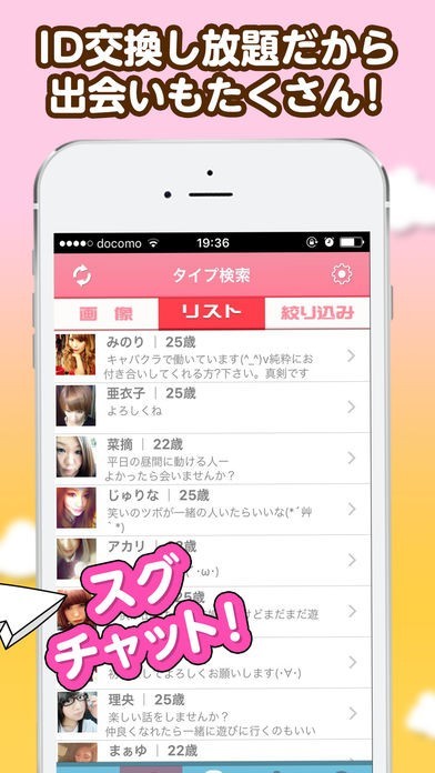 画像で事前に顔を確認することができるので、自分好みの女性を見つけやすく便利です。画像をタップすればチャットを開始することができます。気になる女性に次々とチャットを申し込めるので手軽です。