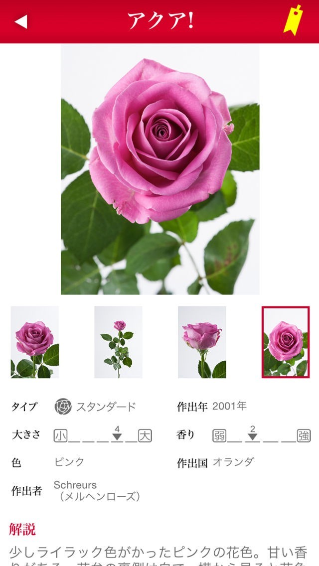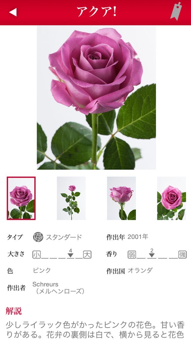 名前や色、花の大きさ、香りの強さなどから、バラを探すことができ、バラ好きのみならず、フラワーデザイナー、フローリスト、生産者にも「使える」図鑑アプリです。