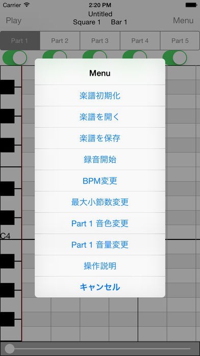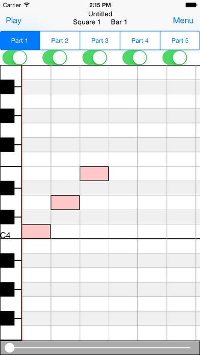 複数パートの作曲も可能で、パート毎に音を鳴らす鳴らさないの指定が、スイッチで切り替えできます。