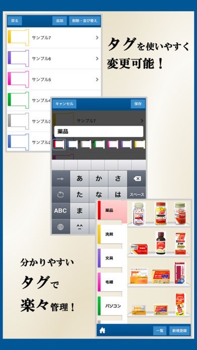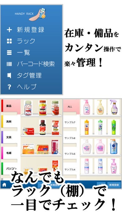 「ハンディラック無料版」にはラック機能が付いており、商品の在庫が分かりやすくなります。 まずは取扱いの在庫商品を撮影し、編集を行っていきます。 在庫商品にタグを付けて管理しておくとさらに便利です。 ネットショップなどでたくさんの商品を扱っている場合、在庫管理が大変になる事がありますが、そんな時の作業がスムーズになります。 検索機能も付いているため、目的の在庫商品が何処にあるのか分かりやすいです。 取扱い中止となった商品は削除ができるために整理も行いやすくなっています。 データ復元機能が付いており、新しいスマホに買い替えた時でもデータの移行がスムーズになります。