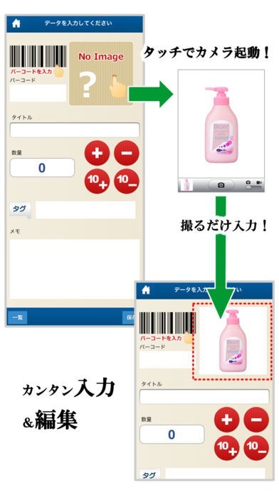 タイトルや画像を入力して、スマートフォンで気軽にお店やオンラインショップの商品在庫管理をすることができる!